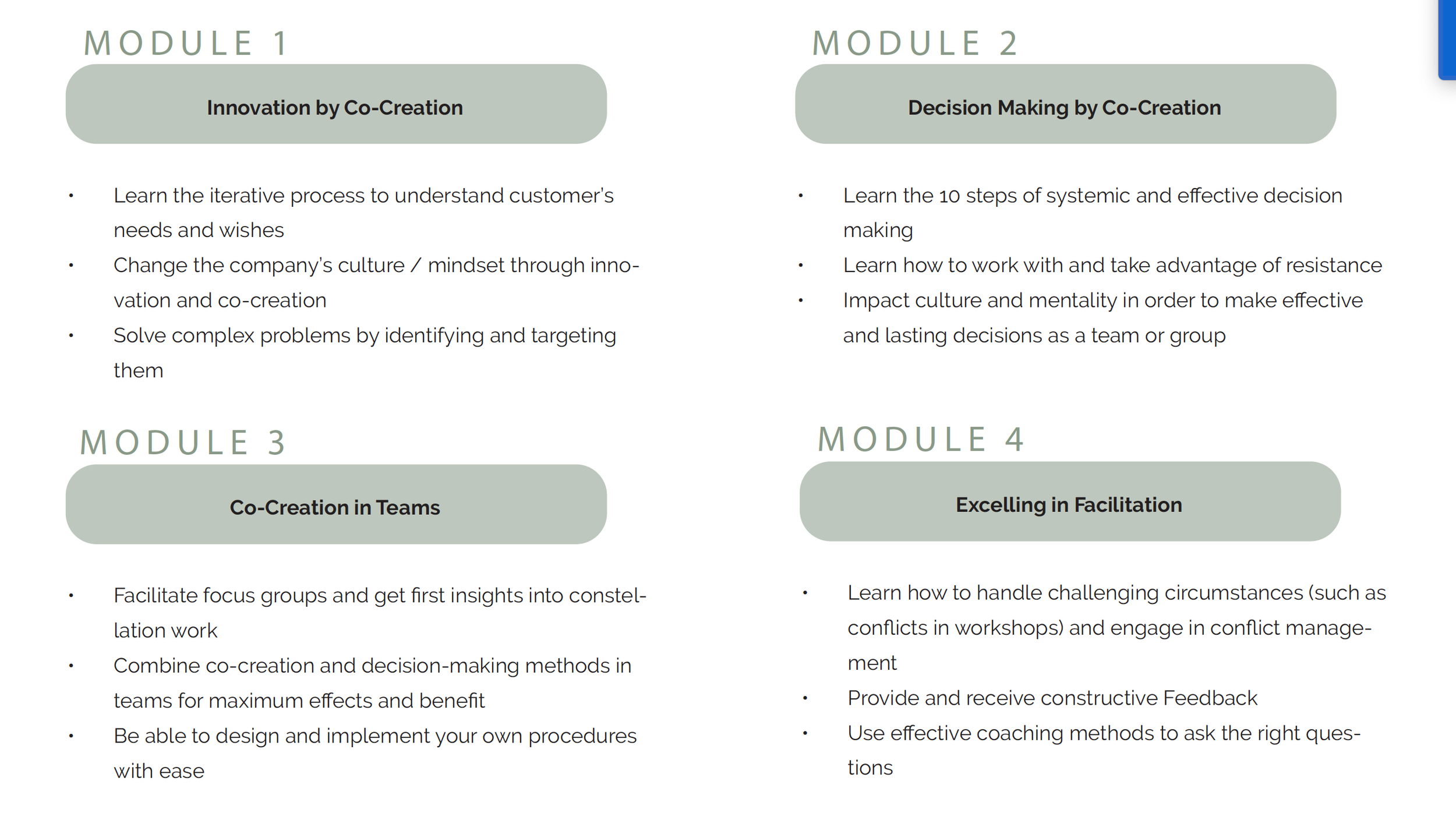 Unser Train the Trainer Programm qualifiziert sich für Entscheidungsfindung, Innovation und Co-Creation-Methoden. Viele unserer Teilnehmer sind in führenden produktiven Workshops als Berater oder Führungskräfte erfolgreich, formulieren Strategien und bringen innovative Ideen in die Welt. Der Hauptvorteil ist, dass Ihr Unternehmen all diese wichtigen Informationen und Erleichterungsfähigkeiten in-house behält. Es verändert die Wachstumskultur des Unternehmens und ermöglicht es jedem, mit einer kundenorientierten Perspektive zu denken.